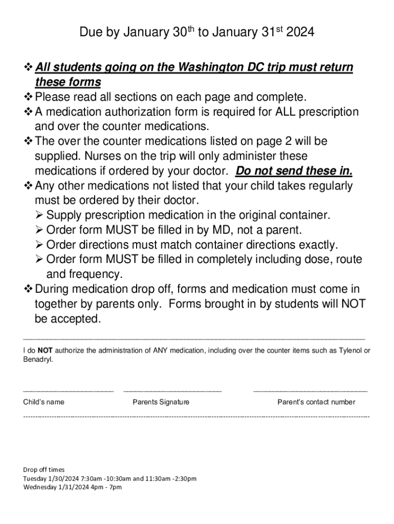 Due by January 30th to January 31st 2024 All students going on the Washington DC trip must return these forms Please read all sections on each page and complete. A medication authorization form is