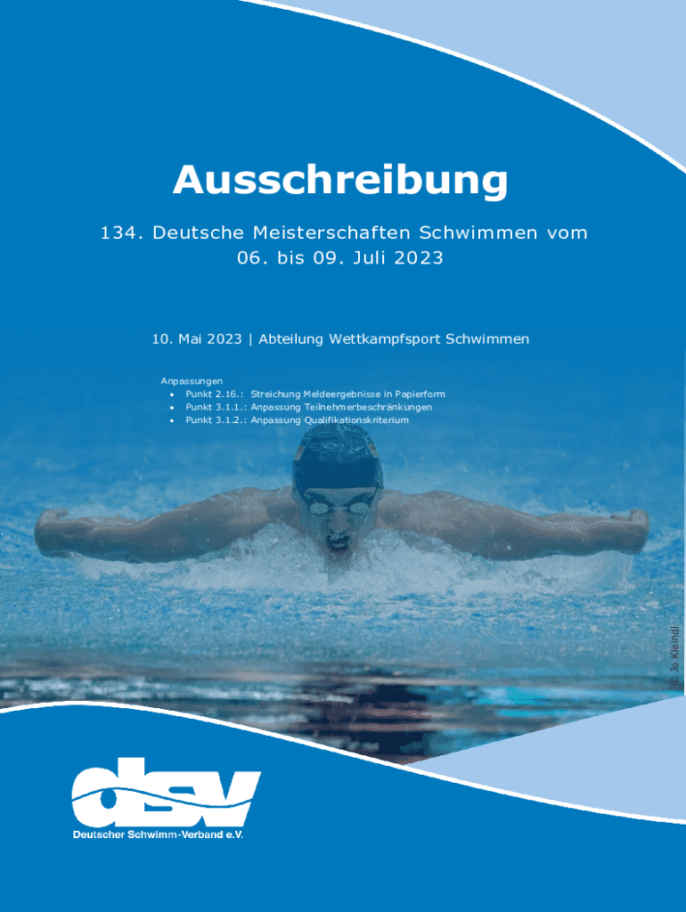 Ausschreibung 134. Deutsche Meisterschaften Schwimmen vom 06. bis 09. Juli 202310. Mai 2023 | Abteilung Wettkampfsport Schwimmen Jo KleindlAnpassungen Punkt 2.16.: Streichung Meldeergebnisse in Papierform