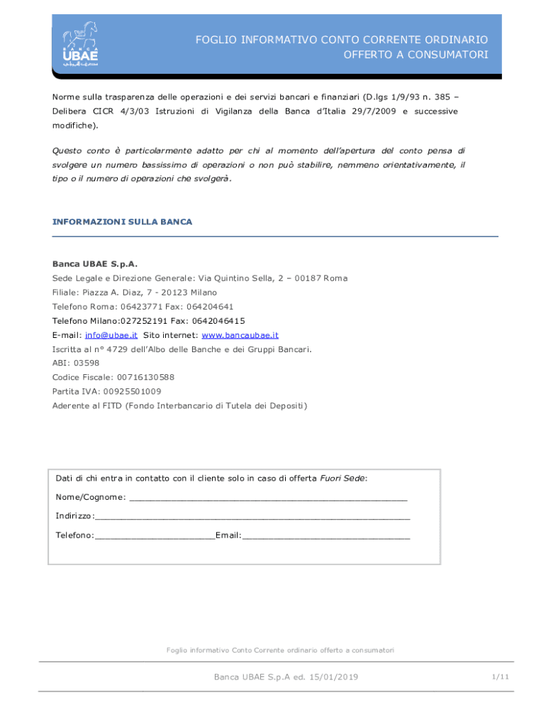 FOGLIO INFORMATIVO CONTO CORRENTE ORDINARIO OFFERTO A CONSUMATORINorme sulla trasparenza delle operazioni e dei servizi bancari e finanziari (D.lgs 1/9/93 n. 385 Delibera CICR 4/3/03 Istruzioni di