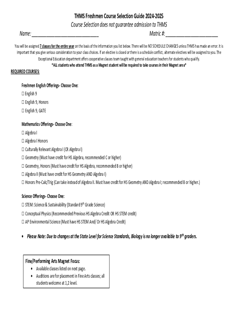 THMS Freshmen Course Selection Guide 20242025 Course Selection does not guarantee admission to THMS Name: ___ Matric #: ___ You will be assigned 7 classes for the entire year on the basis of the information