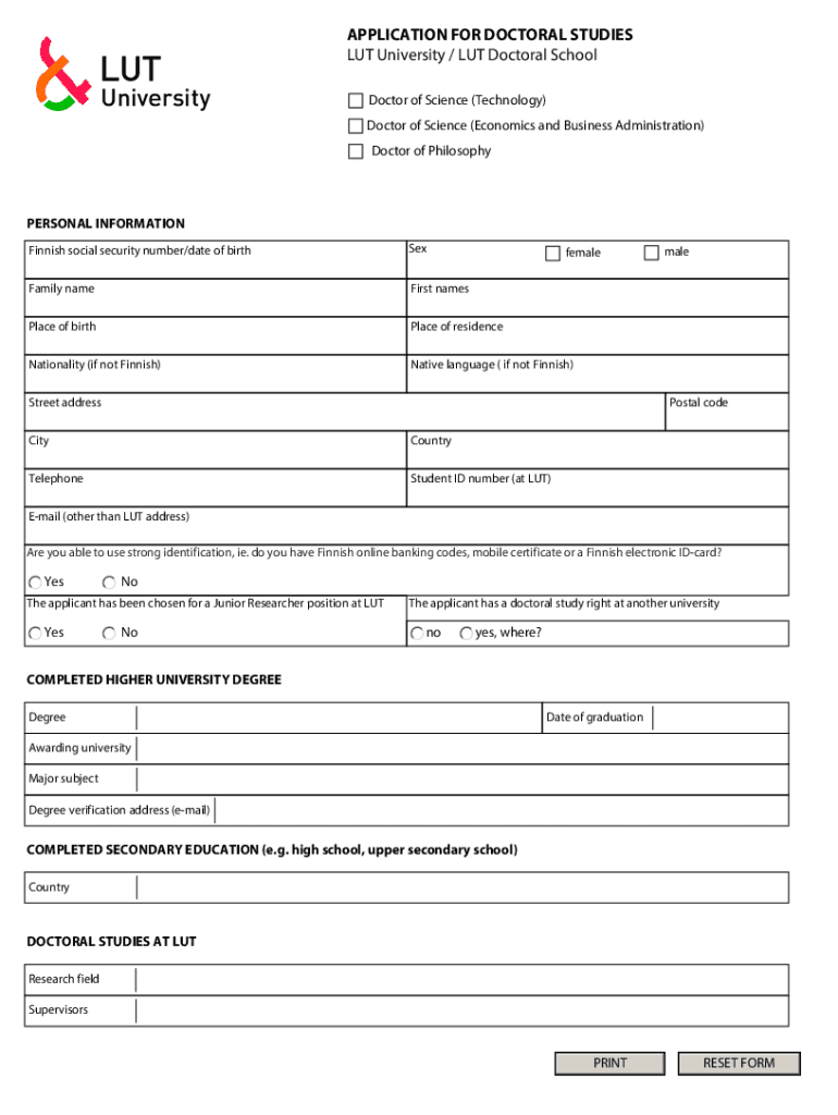 APPLICATION FOR DOCTORAL STUDIES LUT University / LUT Doctoral School Doctor of Science (Technology) Doctor of Science (Economics and Business Administration) Doctor of PhilosophyPERSONAL INFORMATION