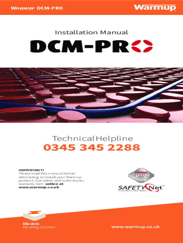 Warmup DCMPROInstallation ManualTechnical Helpline0345 345 2288 IMPORTANT! Please read this manual before attempting to install your Warmup product. Complete and submit your warranty form online at