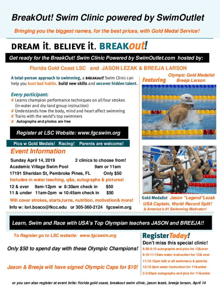 BreakOut! Swim Clinic powered by SwimOutlet Bringing you the biggest names, for the best prices, with Gold Medal Service!dream it. believe it. breakout! Get ready Clinic breakout! Powered by SwimOutlet.com