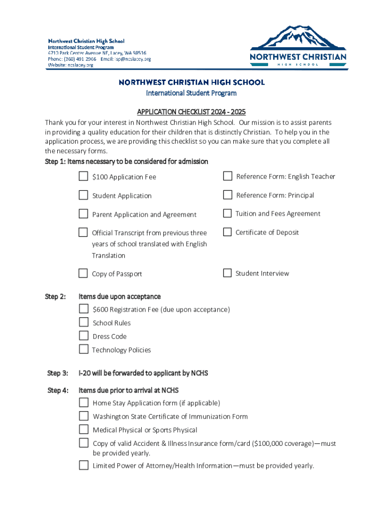 International Student Program APPLICATION CHECKLIST 2024 2025 Thank you for your interest in Northwest Christian High School. Our mission is to assist parents in providing a quality education for
