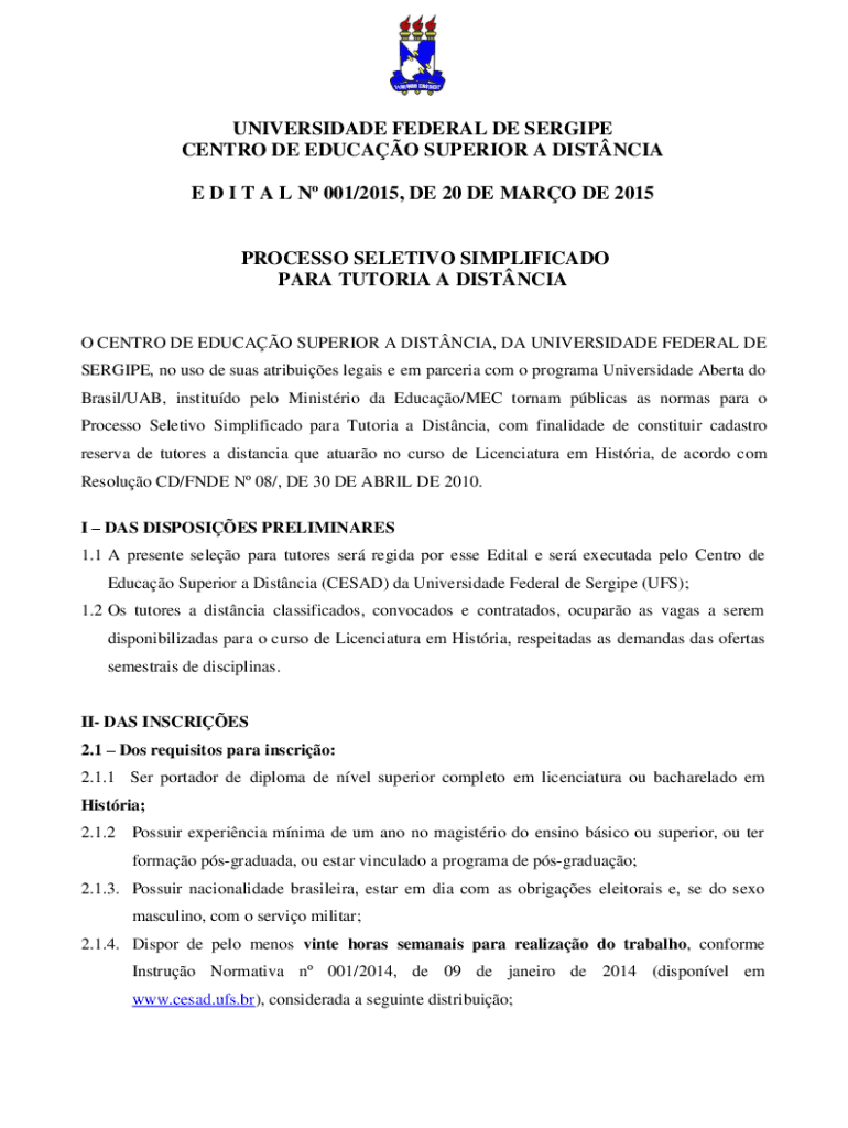 UNIVERSIDADE FEDERAL DE SERGIPE CENTRO DE EDUCAO SUPERIOR A DISTNCIA E D I T A L N 001/2015, DE 20 DE MARO DE 2015PROCESSO SELETIVO SIMPLIFICADO PARA TUTORIA A DISTNCIAO CENTRO DE EDUCAO SUPERIOR