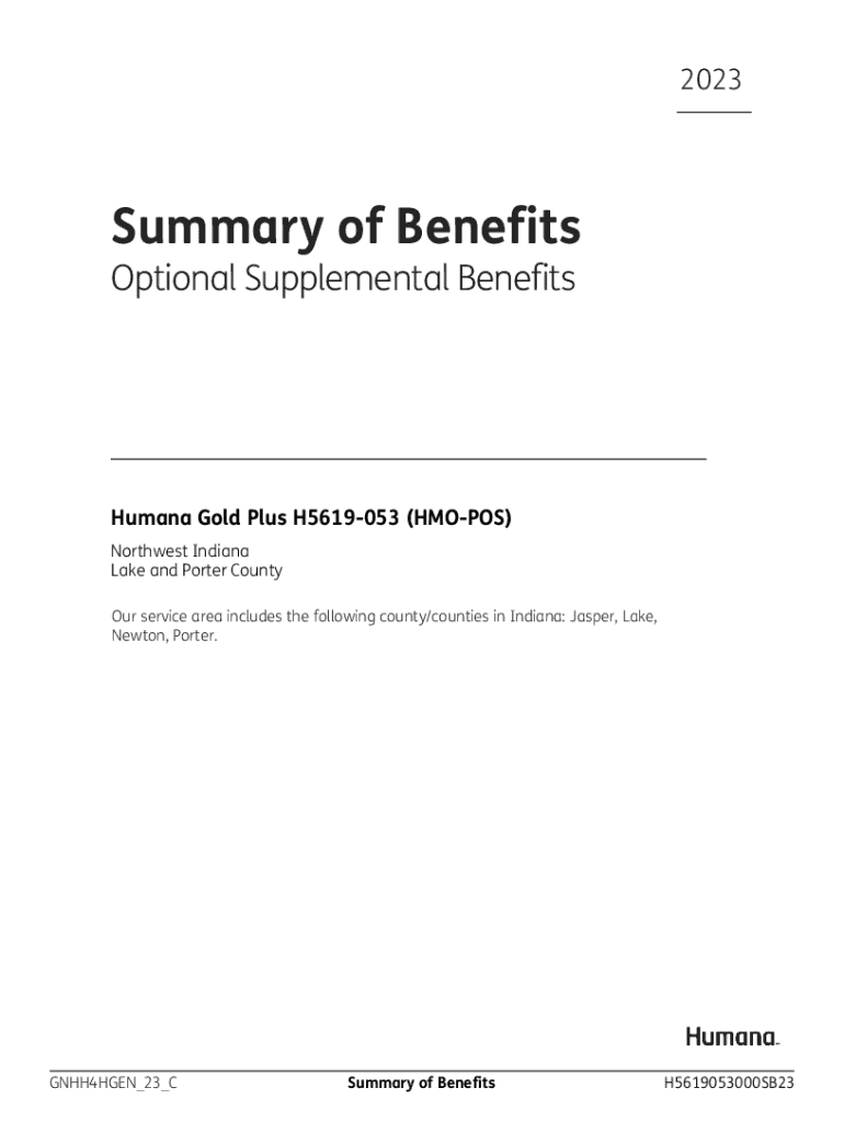 SBOSB0462023Summary of Benefits Optional Supplemental BenefitsHumana Gold Plus H5619053 (HMOPOS) Northwest Indiana Lake and Porter County Our service area includes the following county/counties in