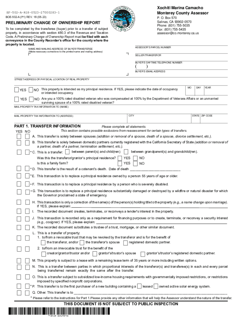 Xochitl Marina Camacho Monterey County AssessorEF502AR180523270002831 BOE502A (P1) REV. 18 (0523)P. O. Box 570 Salinas, CA 939020570 Phone: (831) 7555035 Fax: (831) 7555435 assessor@co.monterey.ca.usPRELIMINARY