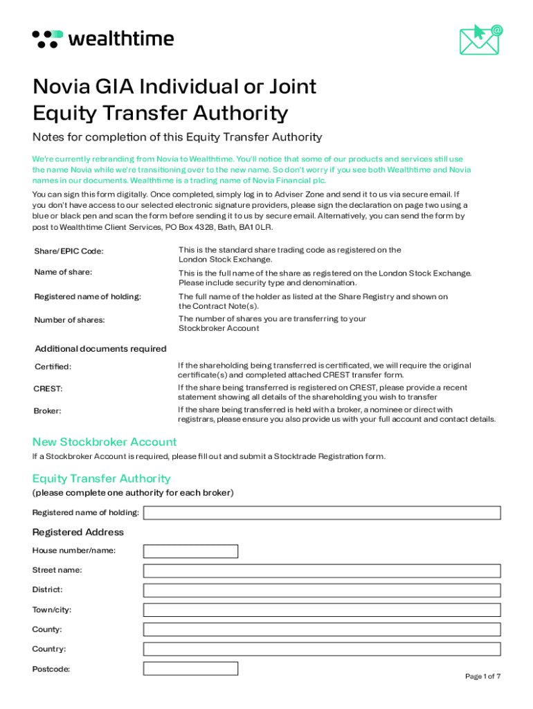Novia GIA Individual or Joint Equity Transfer Authority Notes for completion of this Equity Transfer Authority Were currently rebranding from Novia to Wealthtime. Youll notice that some of our products