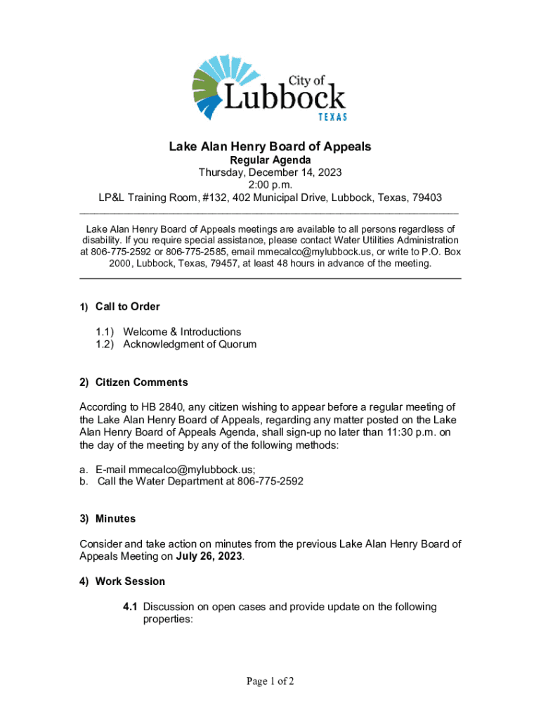 Lake Alan Henry Board of Appeals Regular Agenda Thursday, December 14, 2023 2:00 p.m. LP&L Training Room, #132, 402 Municipal Drive, Lubbock, Texas, 79403 ___Lake Alan Henry Board of Appeals meetings