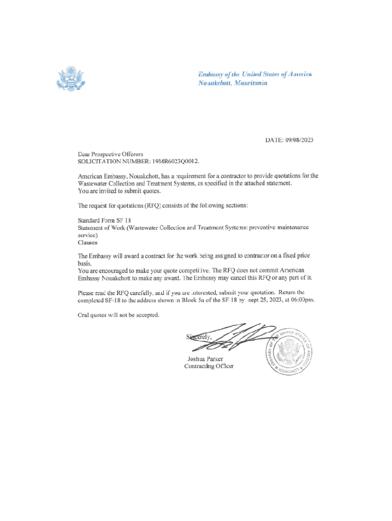 MODIFIED STATEMENT OF WORK (SOW) FOR PREVENTIVE MAINTANENCE SERVICE CONTRACTWastewater Collection and Treatment Systems American Embassy at Nouakchott, MauritaniaOriginal SOW written on 16May2020