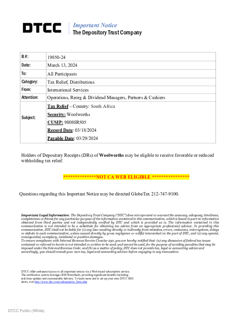 Important Notice The Depository Trust CompanyB #:1985024Date:March 13, 2024To:All ParticipantsCategory:Tax Relief, DistributionsFrom:International ServicesAttention:Operations, Reorg & Dividend Managers,
