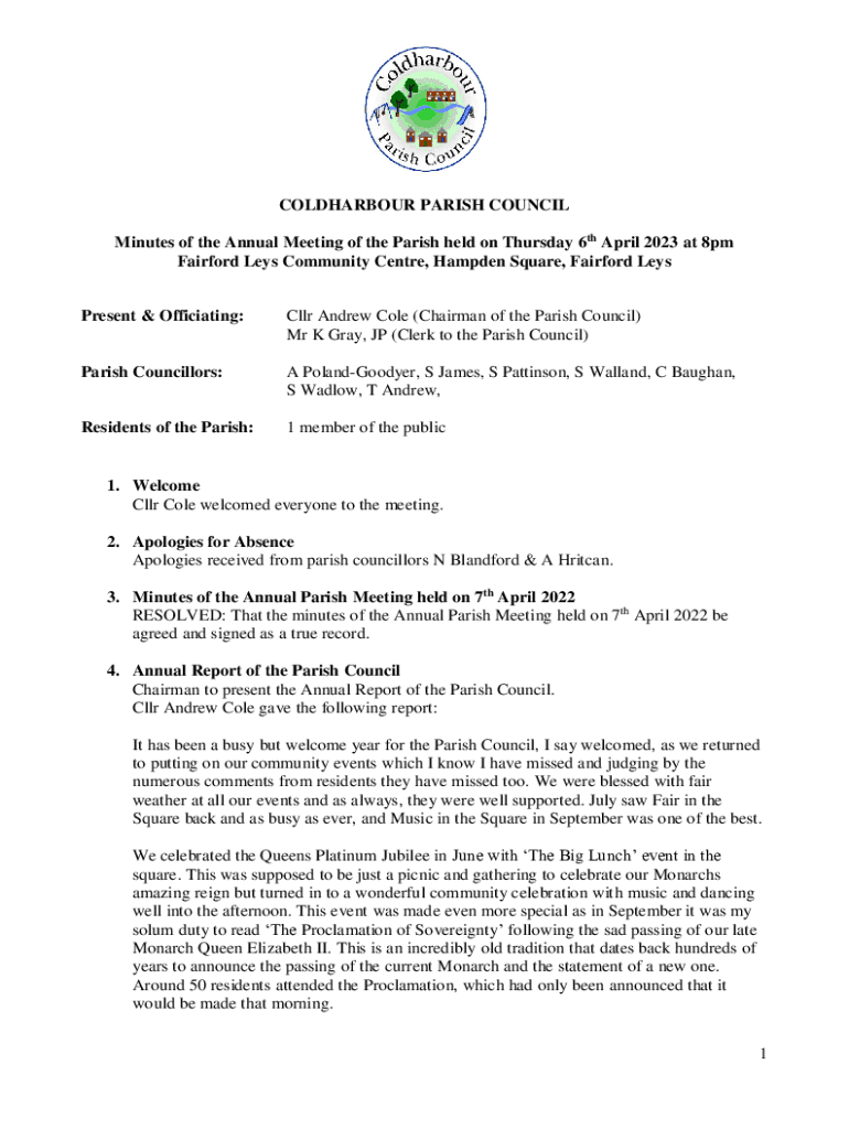 COLDHARBOUR PARISH COUNCIL Minutes of the Annual Meeting of the Parish held on Thursday 6th April 2023 at 8pm Fairford Leys Community Centre, Hampden Square, Fairford LeysPresent & Officiating:Cllr