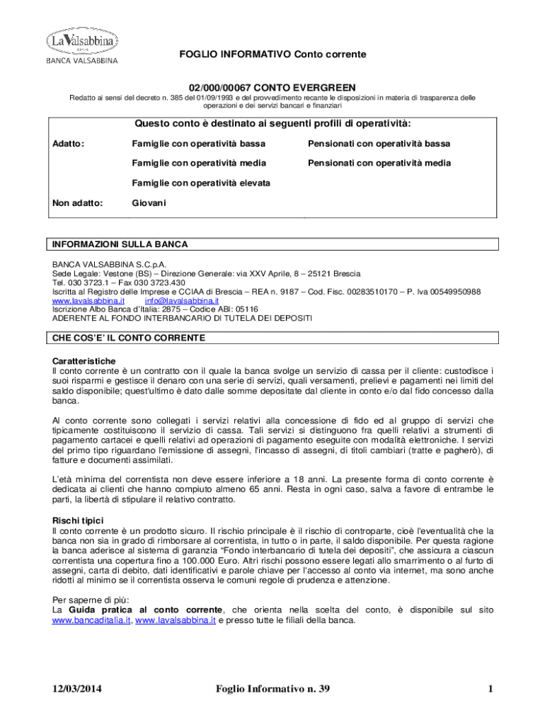 FOGLIO INFORMATIVO Conto corrente02/000/00067 CONTO EVERGREEN Redatto ai sensi del decreto n. 385 del 01/09/1993 e del provvedimento recante le disposizioni in materia di trasparenza delle operazioni