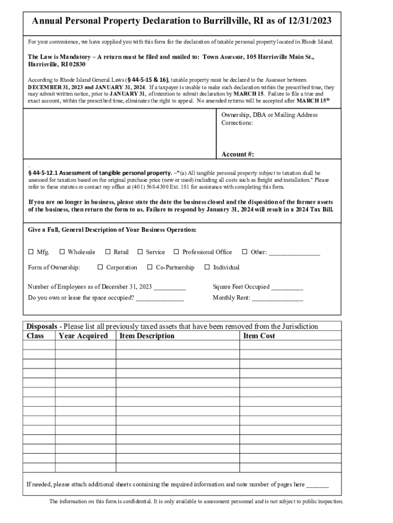 Annual Personal Property Declaration to Burrillville, RI as of 12/31/2023 For your convenience, we have supplied you with this form for the declaration of taxable personal property located in Rhode