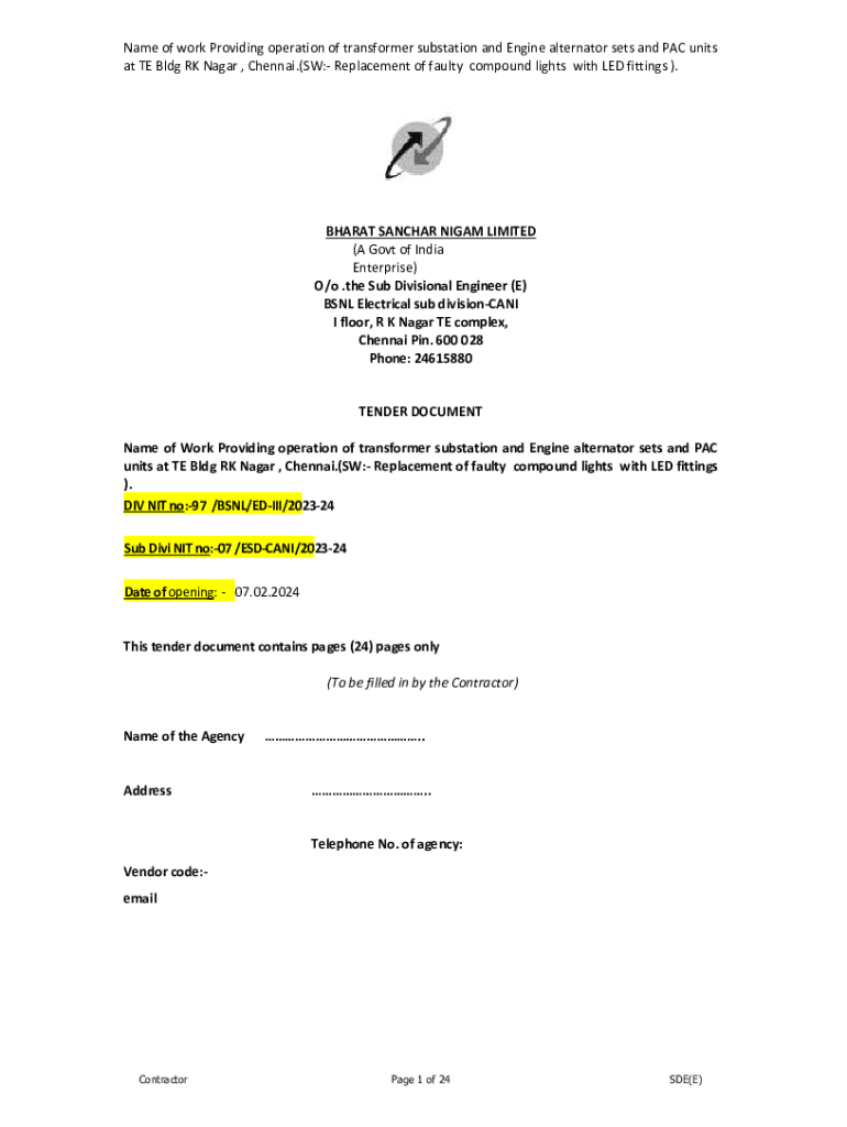 Name of work Providing operation of transformer substation and Engine alternator sets and PAC units at TE Bldg RK Nagar , Chennai.(SW: Replacement of faulty compound lights with LED fittings ).BHARAT
