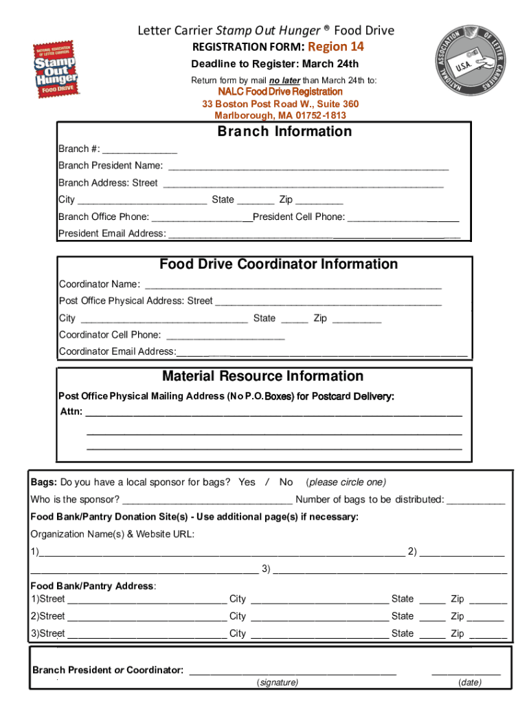 Letter Carrier Stamp Out Hunger Food Drive REGISTRATION FORM: Region 14 Deadline to Register: March 24th Return form by mail no later than March 24th to:NALC Food Drive Registration 33 Boston Post