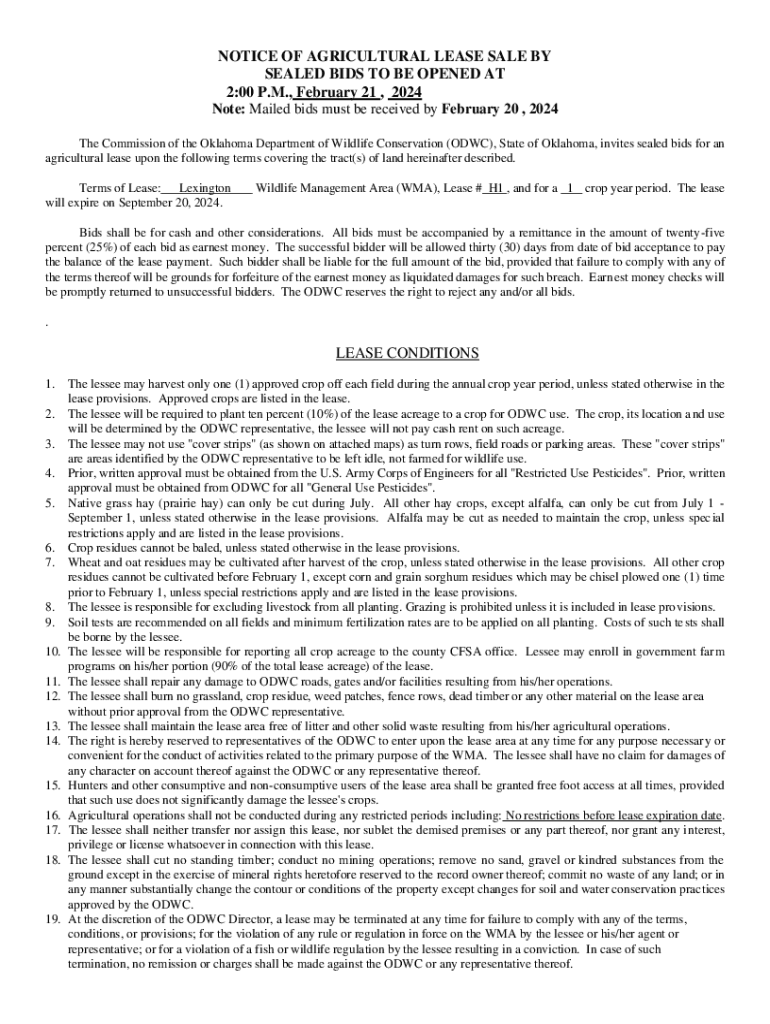 NOTICE OF AGRICULTURAL LEASE SALE BY SEALED BIDS TO BE OPENED AT 2:00 P.M., February 21 , 2024 Note: Mailed bids must be received by February 20 , 2024 The Commission of the Oklahoma Department of