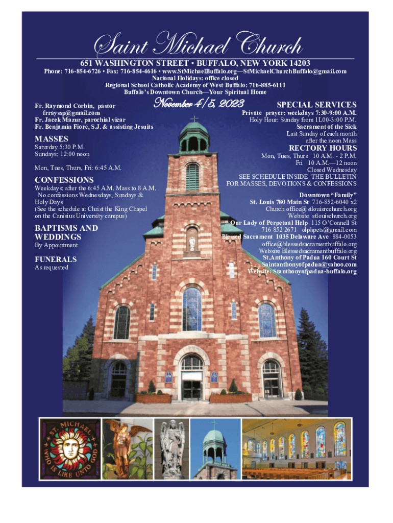 Saint Michael Church651 WASHINGTON STREET BUFFALO, NEW YORK 14203Phone: 7168546726 Fax: 7168544616 www.StMichaelBuffalo.orgStMichaelChurchBuffalo@gmail.com National Holidays: office closed Regional