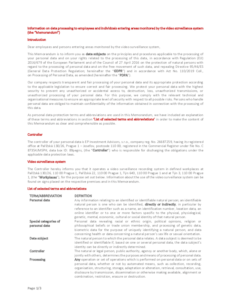 Information on data processing to employees and individuals entering areas monitored by the video surveillance system (the Memorandum) Introduction Dear employees and persons entering areas monitored
