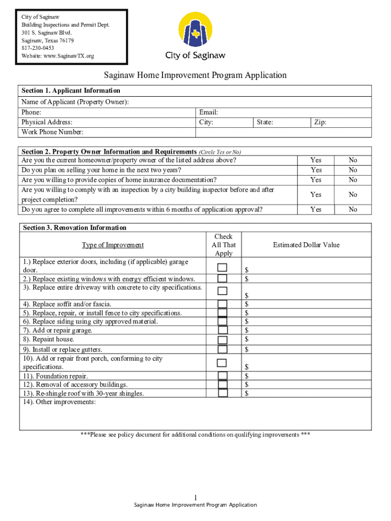 City of Saginaw Building Inspections and Permit Dept. 301 S. Saginaw Blvd. Saginaw, Texas 76179 8172300453 Website: www.SaginawTX.orgSaginaw Home Improvement Program Application Section 1. Applicant