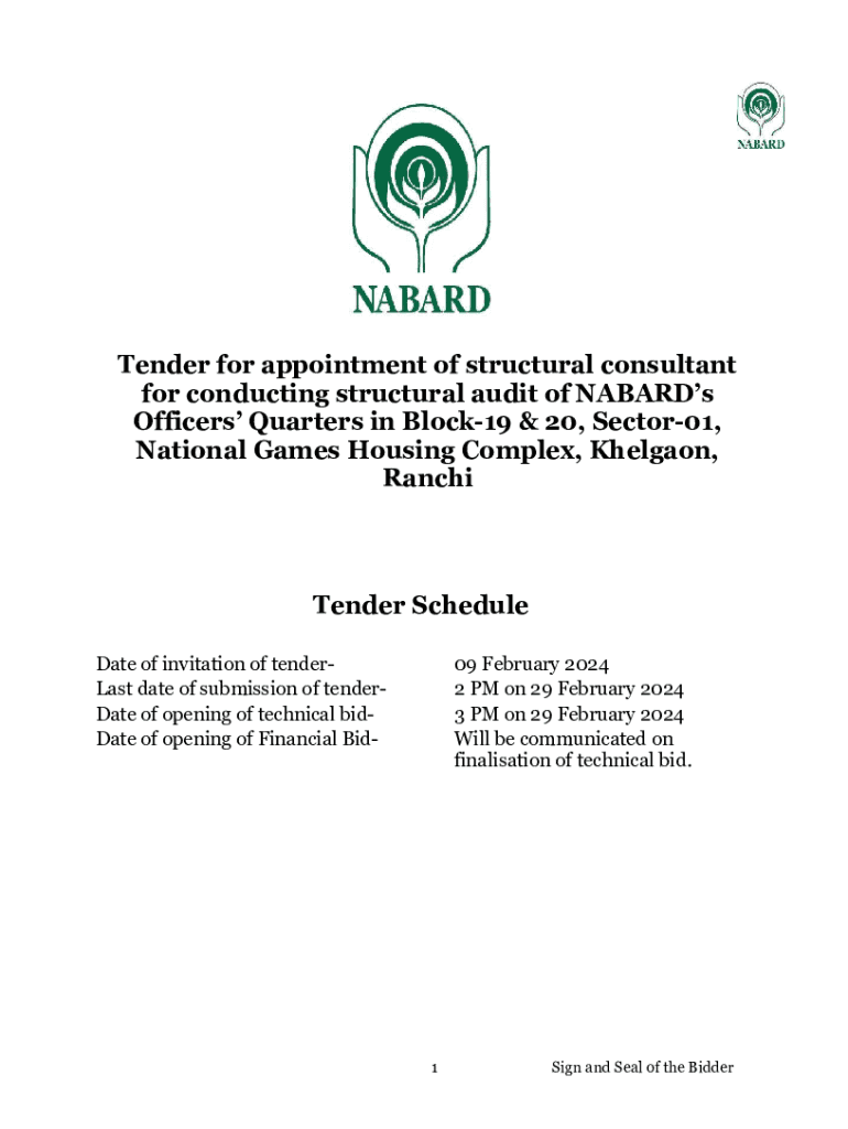 Tender for appointment of structural consultant for conducting structural audit of NABARDs Officers Quarters in Block19 & 20, Sector01, National Games Housing Complex, Khelgaon, RanchiTender Schedule