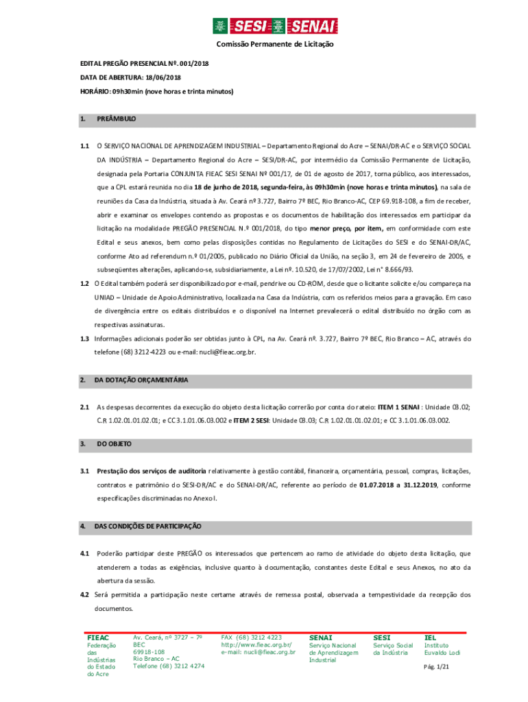 Comisso Permanente de Licitao EDITAL PREGO PRESENCIAL N. 001/2018 DATA DE ABERTURA: 18/06/2018 HORRIO: 09h30min (nove horas e trinta minutos)1.PREMBULO1.1O SERVIO NACIONAL DE APRENDIZAGEM INDUSTRIAL