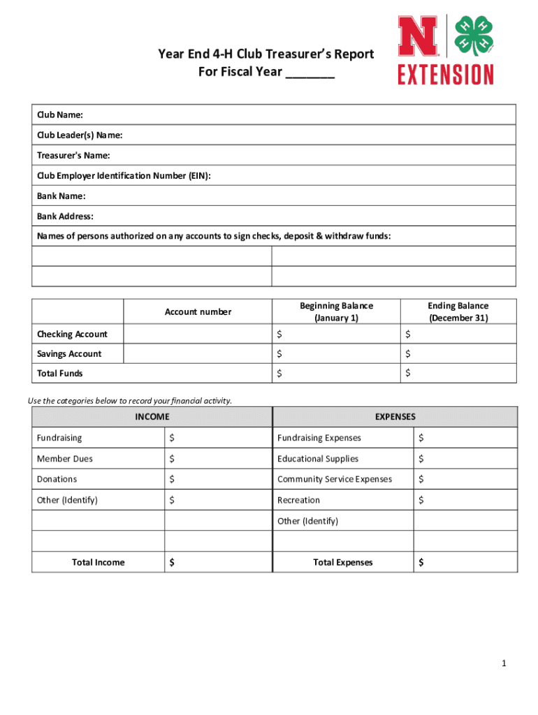 Year End 4H Club Treasurers Report For Fiscal Year ___ Club Name: Club Leader(s) Name: Treasurer\'s Name: Club Employer Identification Number (EIN): Bank Name: Bank Address: Names of persons authorized