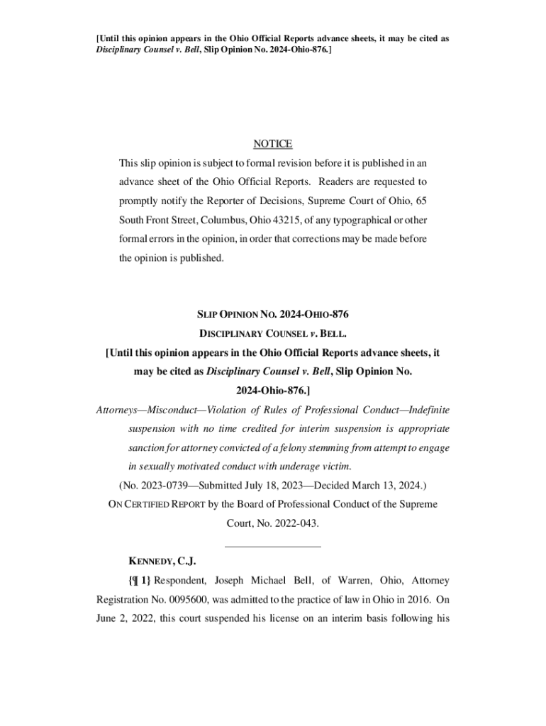 [Until this opinion appears in the Ohio Official Reports advance sheets, it may be cited as Disciplinary Counsel v. Bell, Slip Opinion No. 2024Ohio876.]NOTICE This slip opinion is subject to formal