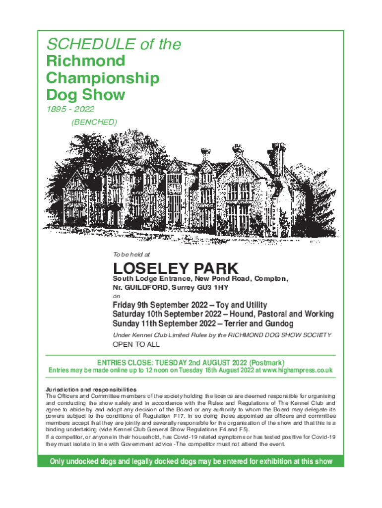 SCHEDULE of the Richmond Championship Dog Show 1895 2022 (BENCHED)To be held atLOSELEY PARK South Lodge Entrance, New Pond Road, Compton, Nr. GUILDFORD, Surrey GU3 1HY onFriday 9th September 2022