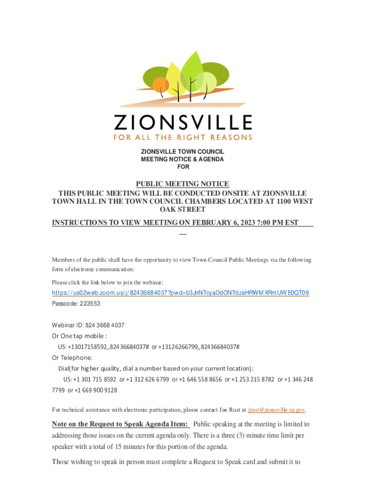 ZIONSVILLE TOWN COUNCIL MEETING NOTICE & AGENDA FORPUBLIC MEETING NOTICE THIS PUBLIC MEETING WILL BE CONDUCTED ONSITE AT ZIONSVILLE TOWN HALL IN THE TOWN COUNCIL CHAMBERS LOCATED AT 1100 WEST OAK