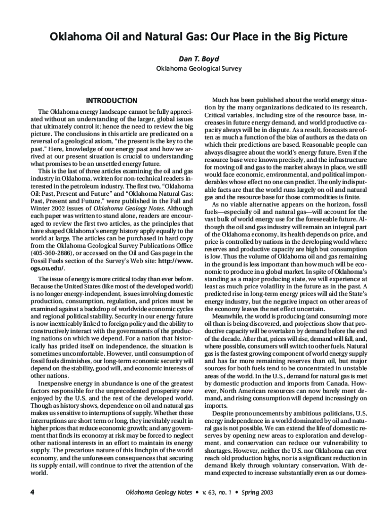 Oklahoma Oil and Natural Gas: Our Place in the Big Picture Dan T. Boyd Oklahoma Geological SurveyINTRODUCTION The Oklahoma energy landscape cannot be fully appreciated without an understanding of