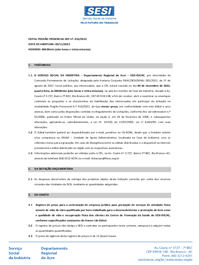 EDITAL PREGO PRESENCIAL SRP n. 016/2022 DATA DE ABERTURA: 09/11/2022 HORRIO: 08h30min (oito horas e trinta minutos)1.PREMBULO1.1 O SERVIO SOCIAL DA INDSTRIA Departamento Regional do Acre SESIDR/AC,