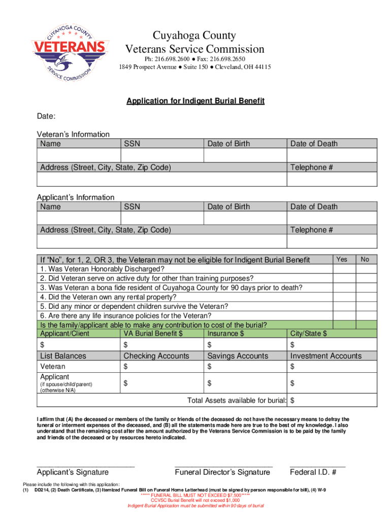 Cuyahoga County Veterans Service Commission Ph: 216.698.2600 Fax: 216.698.2650 1849 Prospect Avenue Suite 150 Cleveland, OH 44115Application for Indigent Burial Benefit Date: Veterans Information