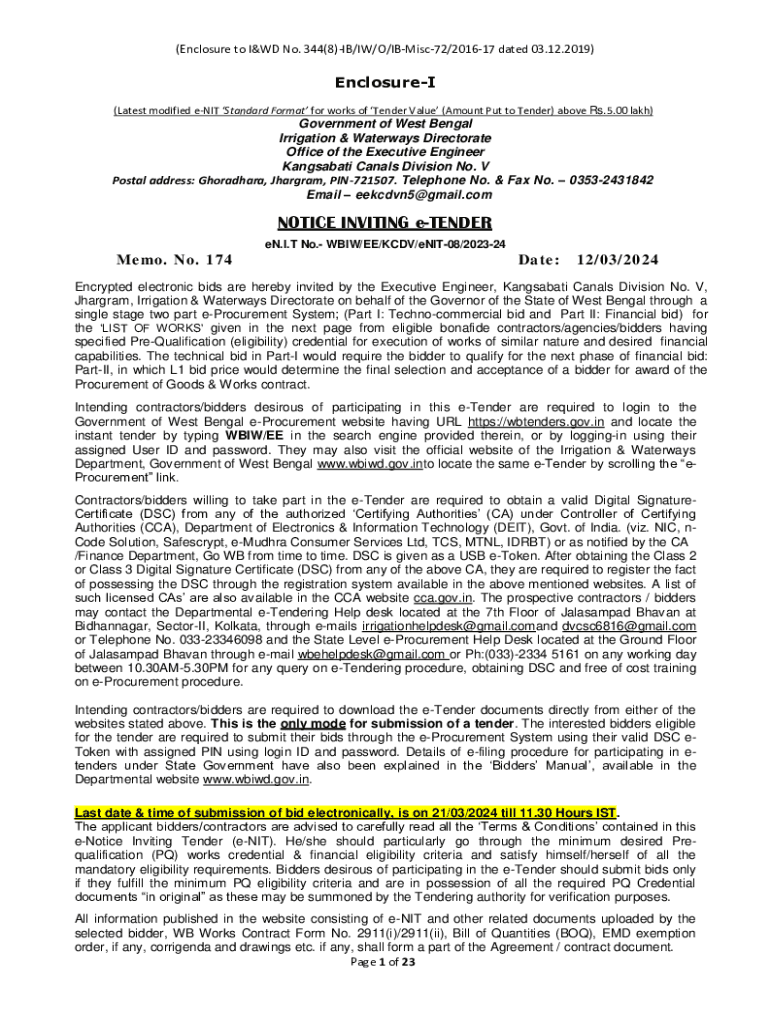(Enclosure to I&WD No. 344(8)IB/IW/O/IBMisc72/201617 dated 03.12.2019)EnclosureI (Latest modified eNIT Standard Format for works of Tender Value (Amount Put to Tender) above Rs.5.00 lakh)Government