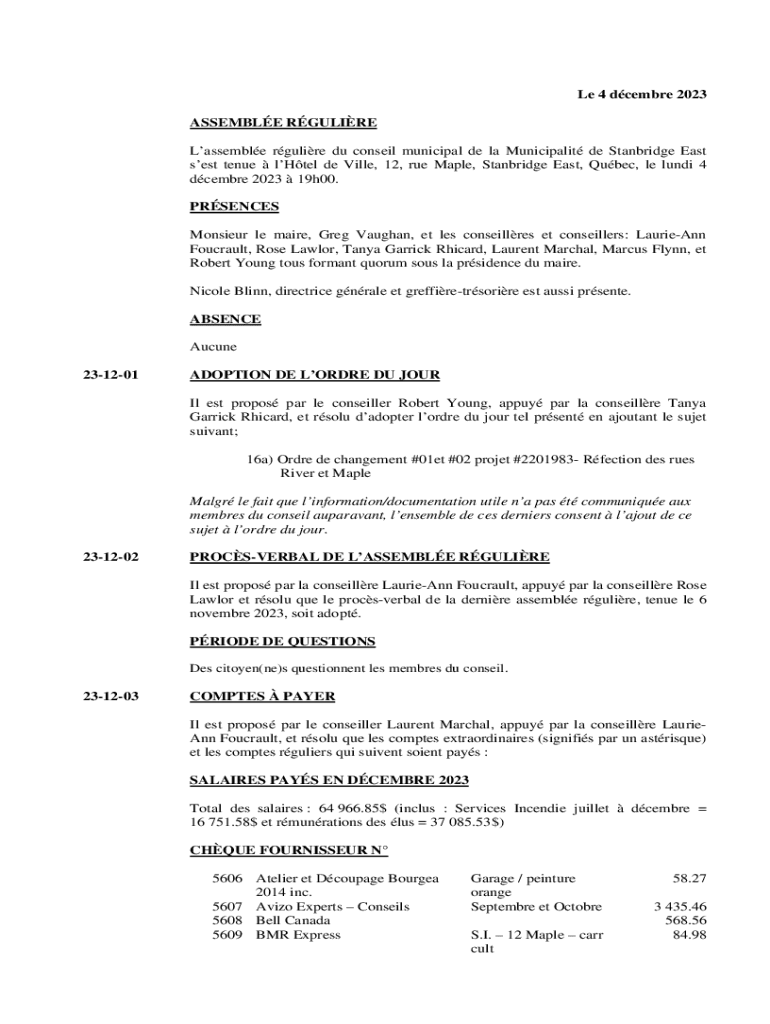 Le 4 dcembre 2023 ASSEMBLE RGULIRE Lassemble rgulire du conseil municipal de la Municipalit de Stanbridge East sest tenue lHtel de Ville, 12, rue Maple, Stanbridge East, Qubec, le lundi 4 dcembre