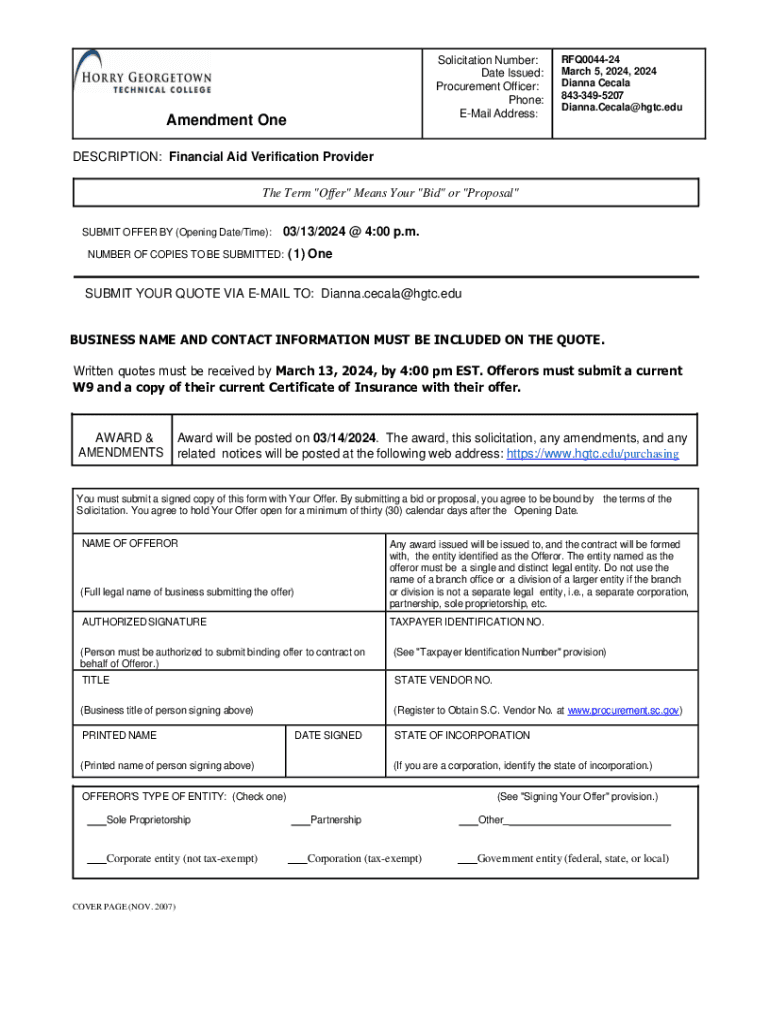 Solicitation Number: Date Issued: Procurement Officer: Phone: EMail Address:Amendment OneRFQ004424 March 5, 2024, 2024 Dianna Cecala 8433495207 Dianna.Cecala@hgtc.eduDESCRIPTION: Financial Aid Verification
