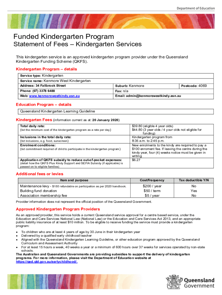 Funded Kindergarten Program Statement of Fees Kindergarten Services This kindergarten service is an approved kindergarten program provider under the Queensland Kindergarten Funding Scheme (QKFS).