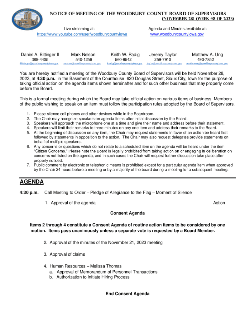 NOTICE OF MEETING OF THE WOODBURY COUNTY BOARD OF SUPERVISORS (NOVEMBER 28) (Week 48 of 2023) ILive streaming at: https://www.youtube.com/user/woodburycountyiowaDaniel A. Bittinger IIMark Nelson38944055401259dbittinger@woodburycountyiowa.govmnelson@woodburycountyiowa.govKeith