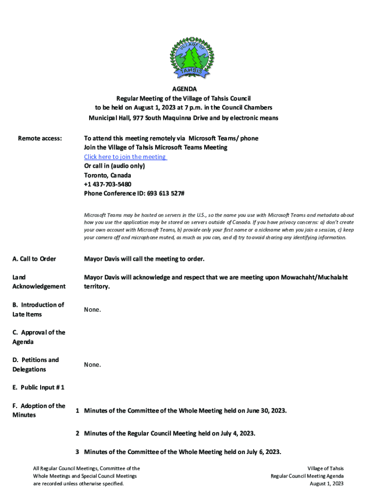 AGENDA Regular Meeting of the Village of Tahsis Council to be held on August 1, 2023 at 7 p.m. in the Council Chambers Municipal Hall, 977 South Maquinna Drive and by electronic means Remote access:To