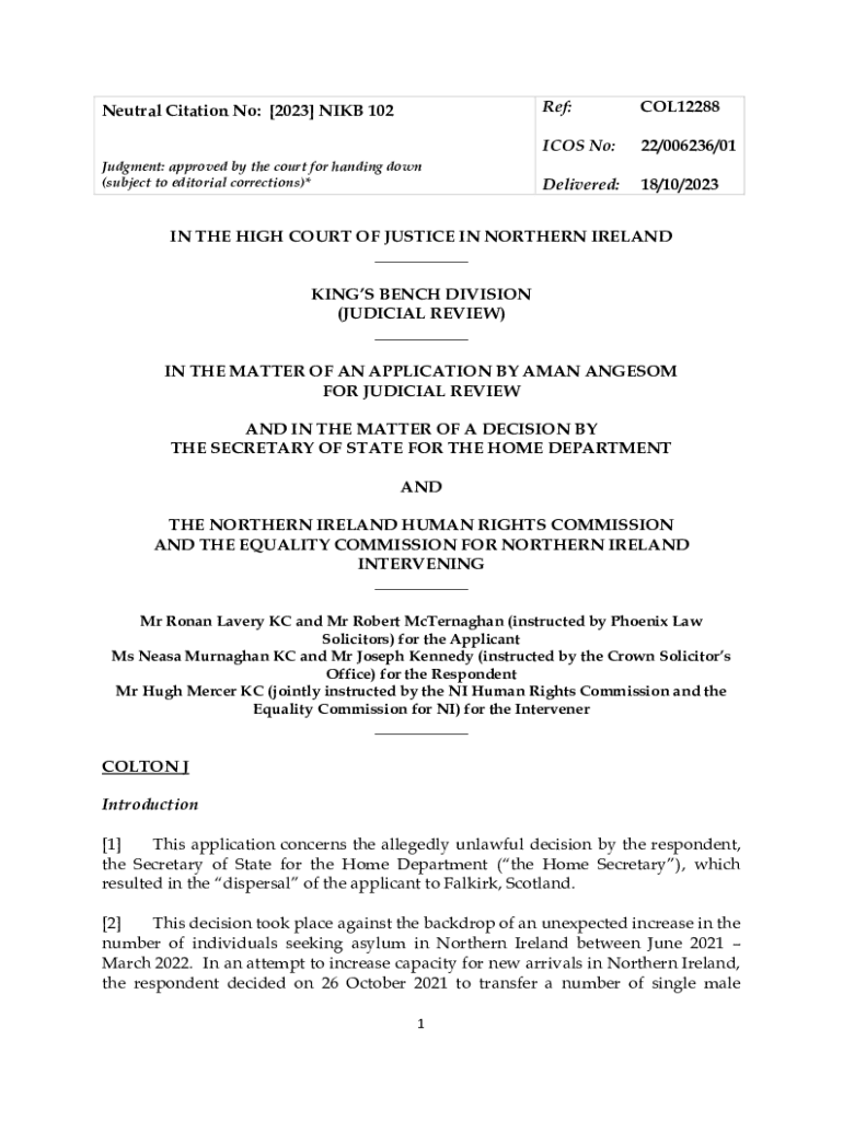 Neutral Citation No: [2023] NIKB 102 Judgment: approved by the court for handing down (subject to editorial corrections)*Ref:COL12288ICOS No:22/006236/01Delivered:18/10/2023IN THE HIGH COURT OF JUSTICE