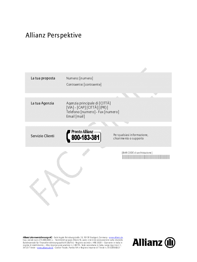 Allianz PerspektiveLa tua propostaNumero: [numero] Contraente: [contraente]La tua AgenziaServizio ClientiAgenzia principale di [CITT] [VIA] [CAP] [CITT] [(PR)] Telefono [numero] Fax [numero] Email