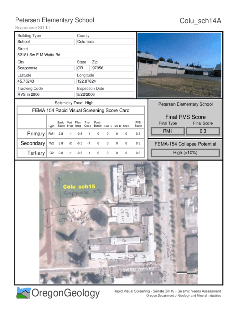 Petersen Elementary SchoolColu_sch14AScappoose SD 1J Building TypeCountySchoolColumbiaStreet 52181 Sw E M Watts Rd CityStateZipScappooseOR97056LatitudeLongitude45.75243122.87824Tracking CodeInspection