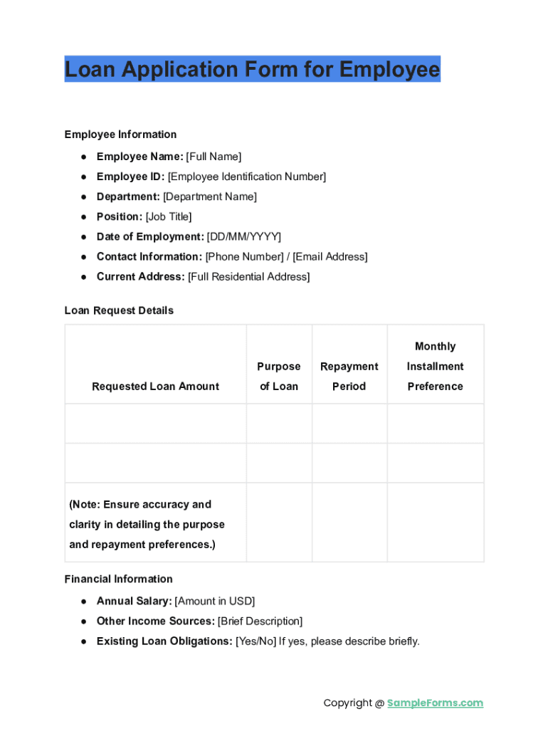 Loan Application Form for Employee Employee Information Employee Name: [Full Name] Employee ID: [Employee Identification Number] Department: [Department Name] Position: [Job Title] Date of Employment: