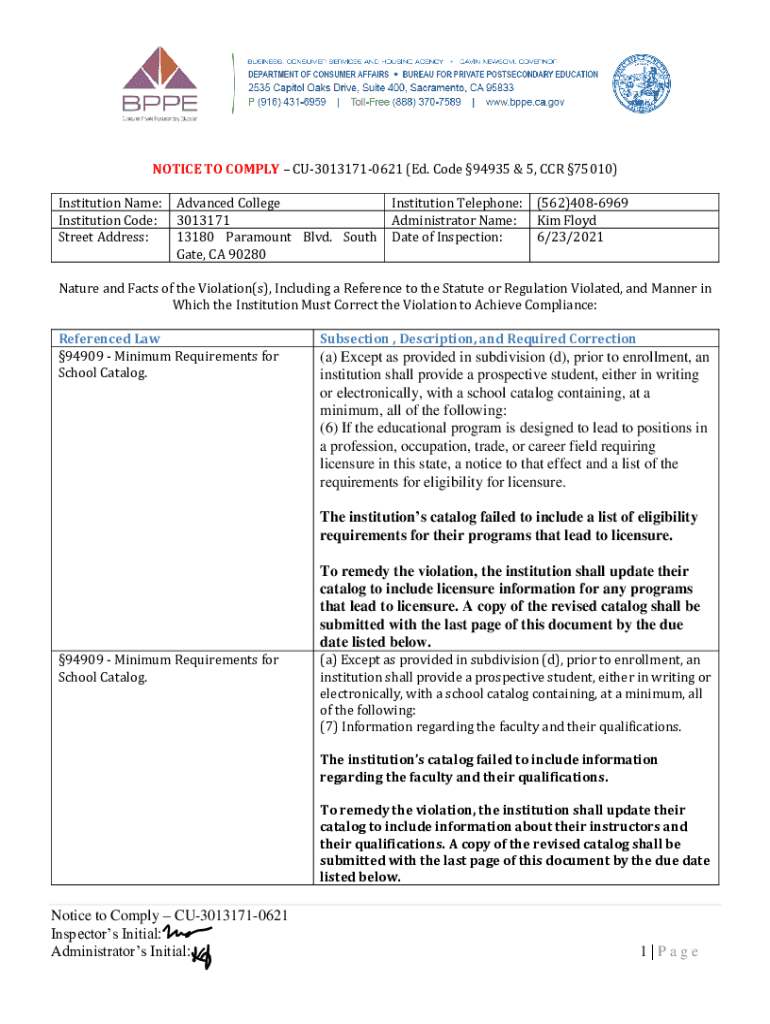 NOTICE TO COMPLY CU30131710621 (Ed. Code 94935 & 5, CCR 75010) Institution Name: Institution Code: Street Address:Advanced College Institution Telephone: (562)4086969 3013171 Administrator Name: Kim