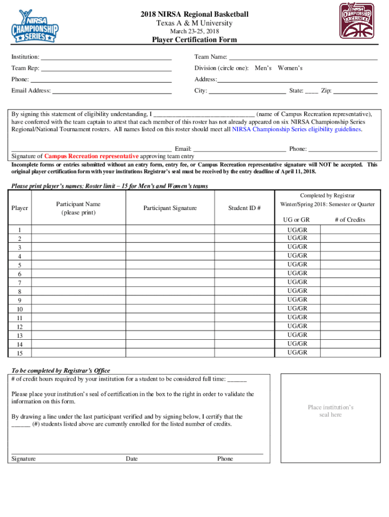 2018 NIRSA Regional Basketball Texas A & M University March 2325, 2018Player Certification Form Institution:Team Name:Team Rep:Division (circle one):Phone:Address:Email Address:City:MensWomensState: