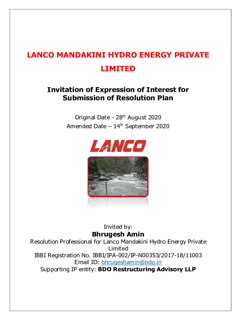 LANCO MANDAKINI HYDRO ENERGY PRIVATE LIMITED Invitation of Expression of Interest for Submission of Resolution Plan Original Date 28th August 2020 Amended Date 14th September 2020Invited by:Bhrugesh