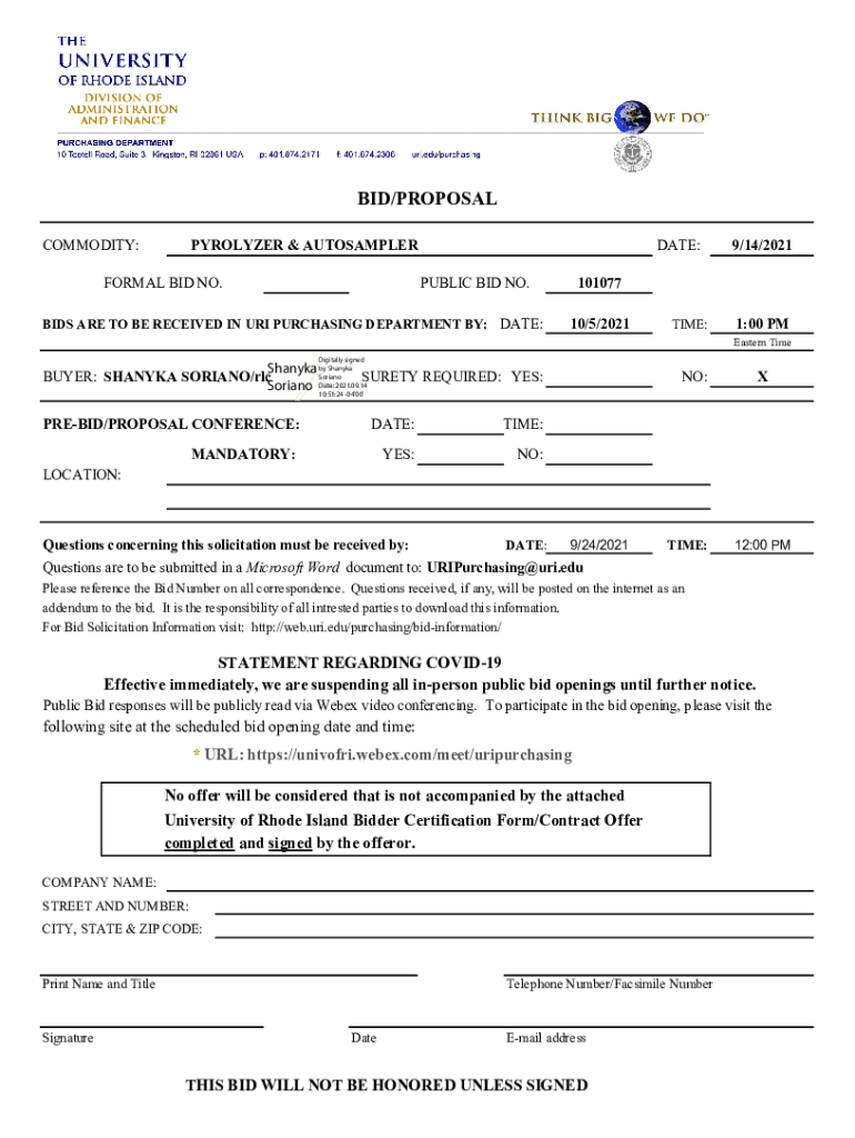 BID/PROPOSAL COMMODITY:PYROLYZER & AUTOSAMPLERFORMAL BID NO.DATE: PUBLIC BID NO.BIDS ARE TO BE RECEIVED IN URI PURCHASING DEPARTMENT BY: DATE:9/14/2021101077 10/5/2021TIME:1:00 PM Eastern TimeDigitally