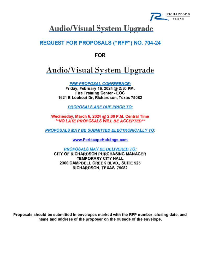 Audio/Visual System Upgrade REQUEST FOR PROPOSALS (RFP) NO. 70424 FORAudio/Visual System Upgrade PREPROPOSAL CONFERENCE: Friday, February 16, 2024 @ 2:30 PM. Fire Training Center EOC 1621 E Lookout