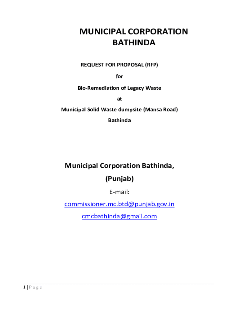 MUNICIPAL CORPORATION BATHINDA REQUEST FOR PROPOSAL (RFP) for BioRemediation of Legacy Waste at Municipal Solid Waste dumpsite (Mansa Road) BathindaMunicipal Corporation Bathinda, (Punjab) Email: