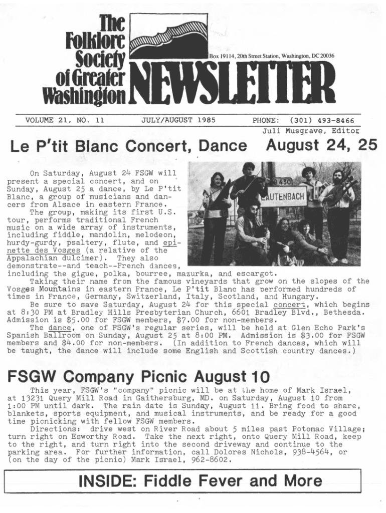 The Folklore___ ki VOLUME 2 1 ,Box 19114,20th Street Station, Washington, DC 20036^ NO.N 11EWSUJU LY/AU G U ST 1 9 8 5TIPHONE:H (301)I 4938466Juli Musgrave, EditocLe P\'tit Blanc Concert, DanceAugust